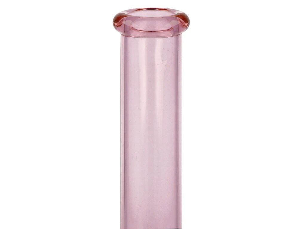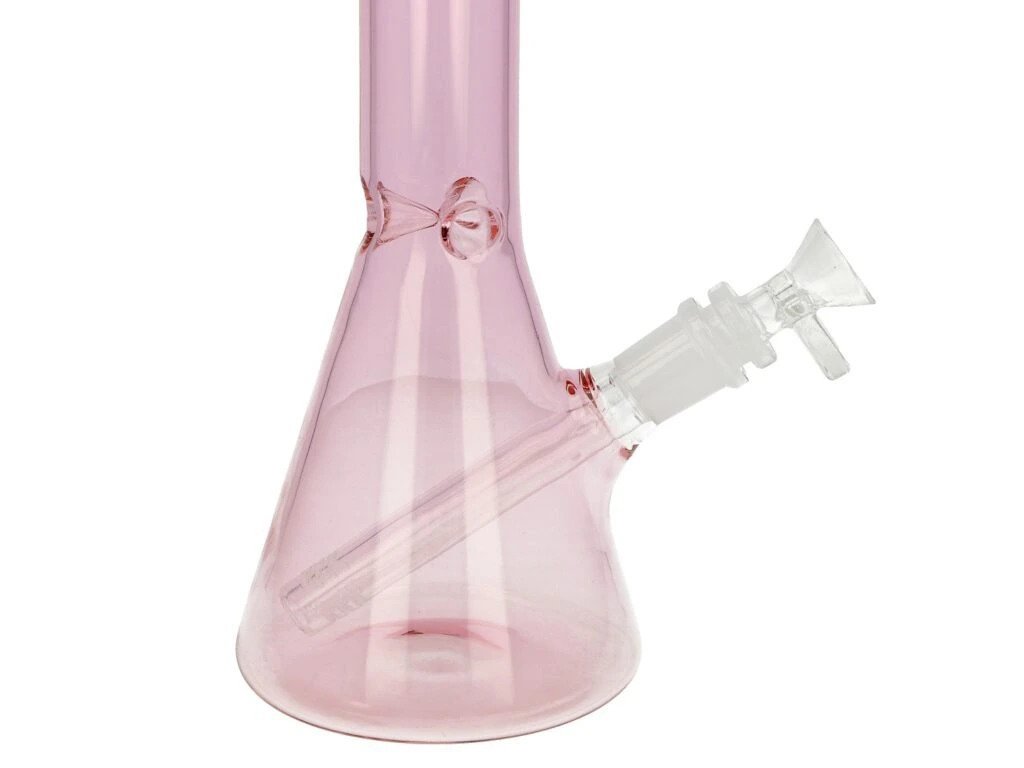 Skleněný bong Super Heroes Pink. Rovný transparentní bong ve tvaru Beaker je v jemném růžovém tónu. Ice bong ukončený silnějším hrdlem je vybavený "výstupky" pro udržení kostek ledu k ochlazení kouře. Oproti standardním bongům je tento prémiový bong vyrobený z tepelně odolného borosilikátového skla tloušťky 4 mm. Dvoudílný chillum s difuzérem je ukončený samostatným kotlíkem s menším otvorem cca 5 mm.